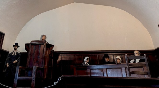 After an intro by the guide, two actors do an onstage reenactment of the trial of Elizabeth Proctor, of Crucible fame, using real historical transcripts and creepy mannequin extras.