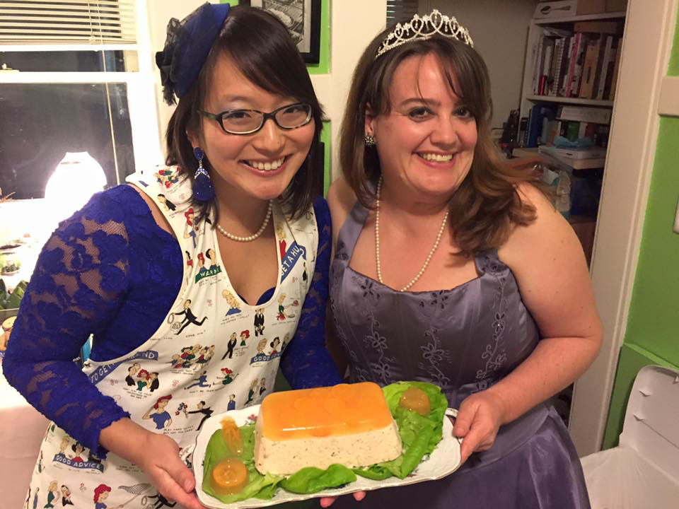 For our Crazy Rich Asians dinner, it was not enough to just make the food. Oh no, we dressed up in our most outrageous finery and broke out the fanciest-ass dishes we could find (which admittedly aren’t THAT fancy because we are Middle Class Librarians, not Crazy Rich Asians). And we found friends that were game to party with us — shout-out to Jennifer, Michael, Erica, John, Erin, Erik, and Andrea!